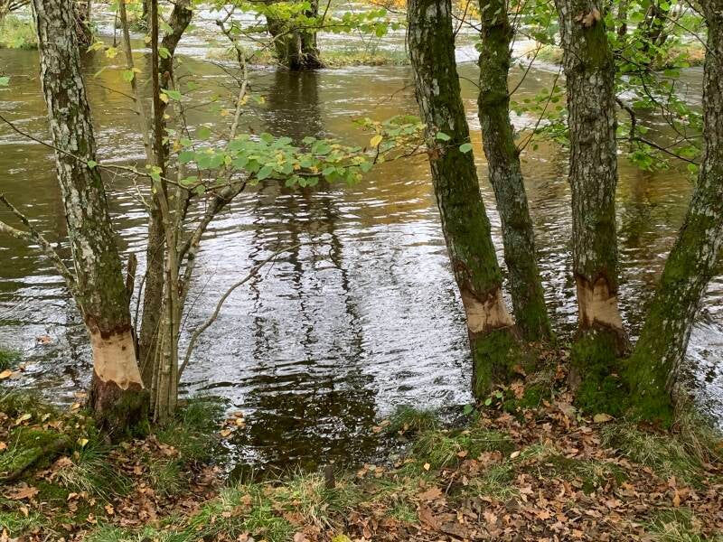 Vandringen är inte särskild kuperad och det är bra stigar. Som syns på bilden ovan har bävrar varit framme! Ibland passerar man beteshagar.